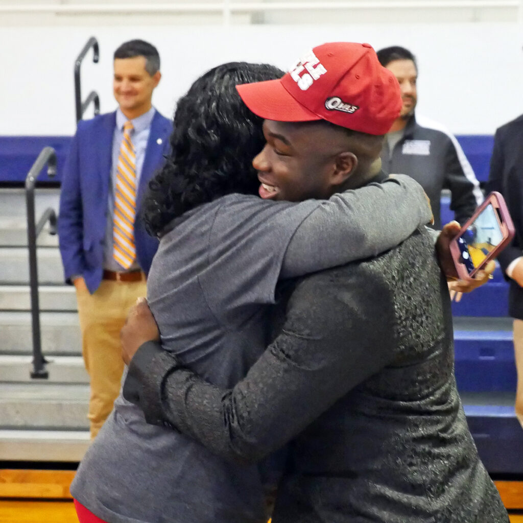 Joann hugs Jo after he signed his letter of intent to attend Temple University on a football scholarship. (Photo by Pete Young/Jesuit High)