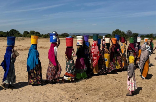 The villages consist mostly of women and children, because the men travel to other parts of the country for work. Those women and children carry the water back to their homes in containers they balance on their heads.
