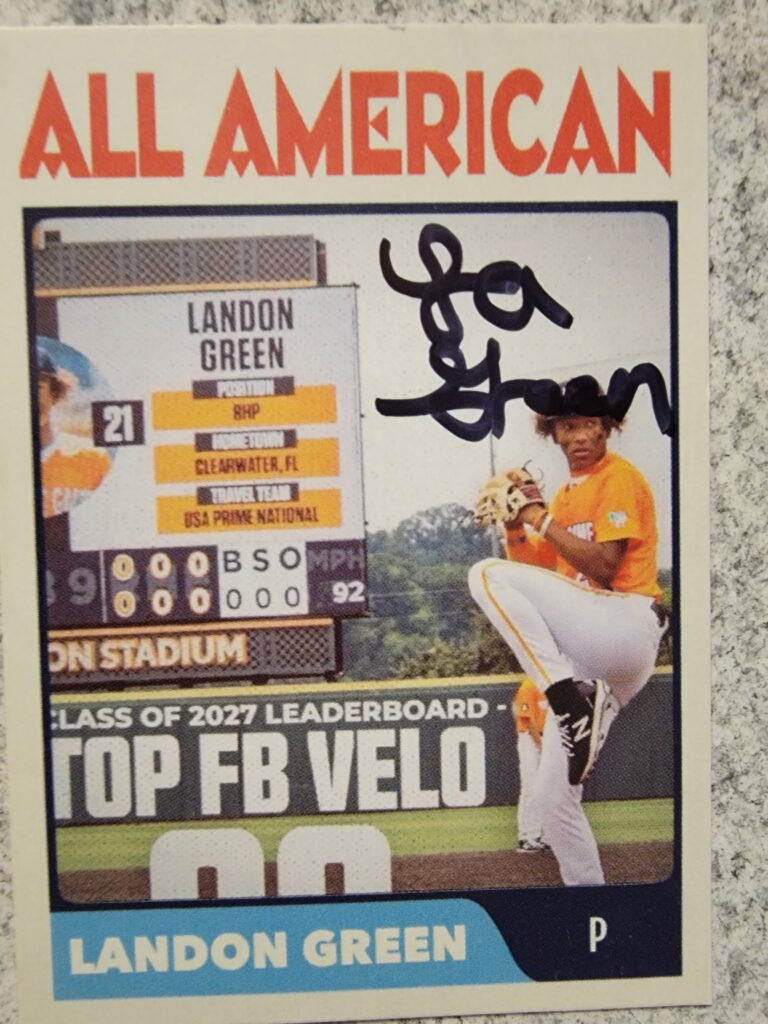 CLEARWATER, Florida – A check recently arrived in the mail for Landon Green, his compensation for the two hours he spent autographing baseball cards of himself one day last summer.